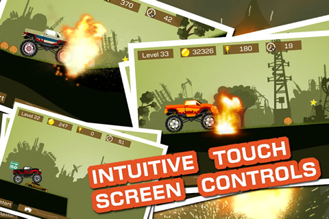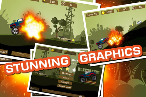 驾驶美式巨型怪物卡车在限定的时间内抵达终点。借助卡车庞大的身躯突破各种障碍(石头,滚木,油桶,报废车辆,僵尸),越过各种险峻的地形。游戏具有一定的挑战度,画面和效果都很好,值得一试哦!