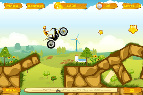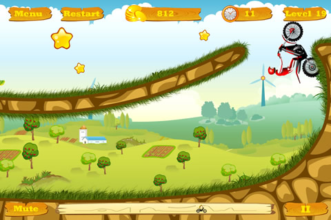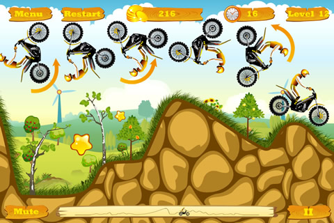这款应用的特点是操作简单,但是要得到高分有难度,需要较强的技巧来控制摩托车尽快的通过精心设计的道路到达终点,才可获得高分。