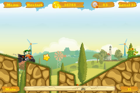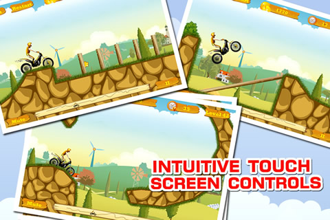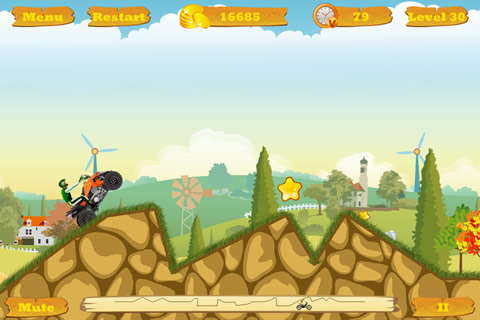 这款应用的特点是操作简单,但是要得到高分有难度,需要较强的技巧来控制摩托车尽快的通过精心设计的道路到达终点,才可获得高分。